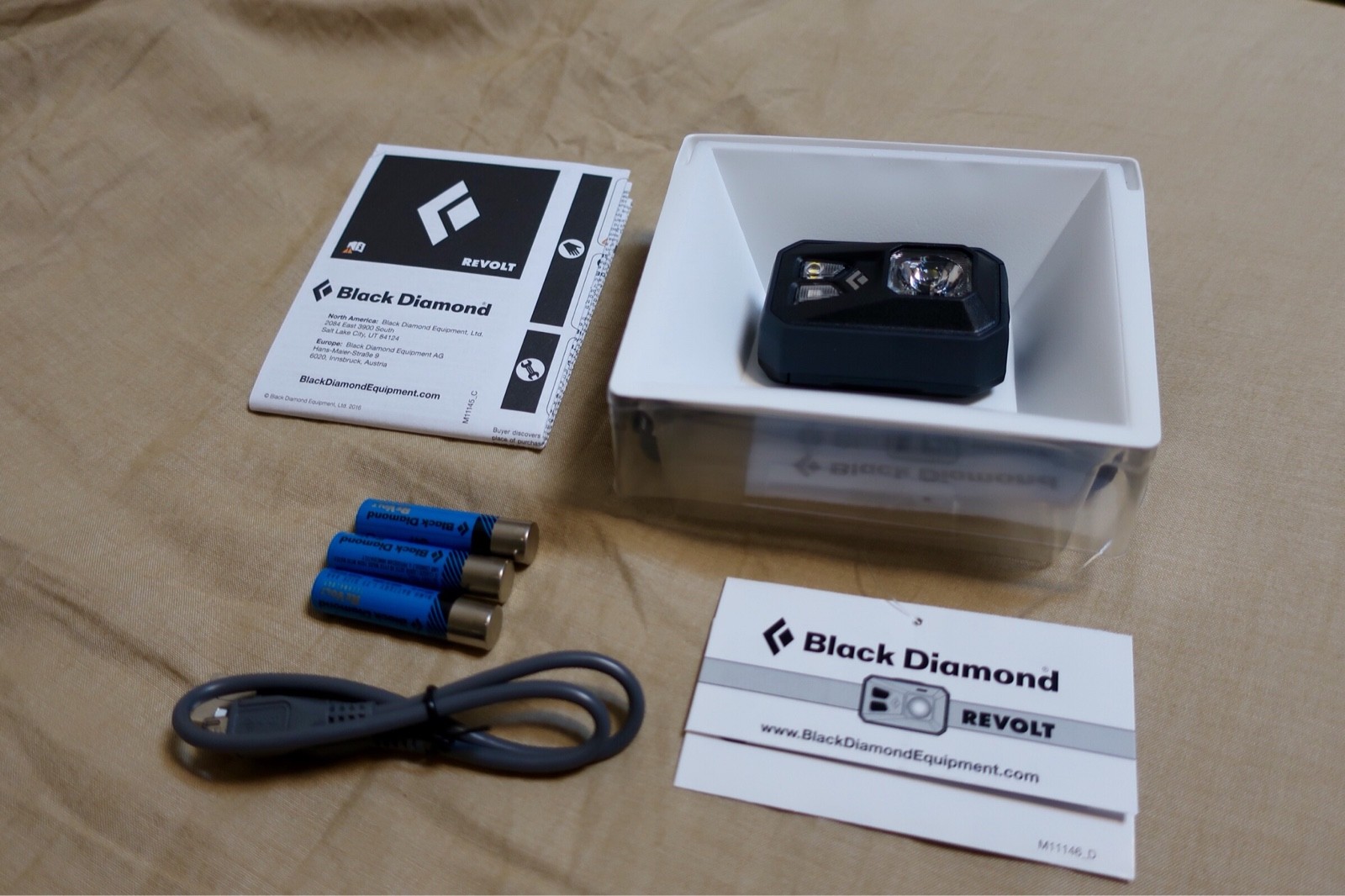 外箱を開封すると、こんな感じの物たちが入っている。 ベルトの「Black Diamond」ロゴは反射材が含まれ得ており、光を受けるとリフレクターの様に光る。
