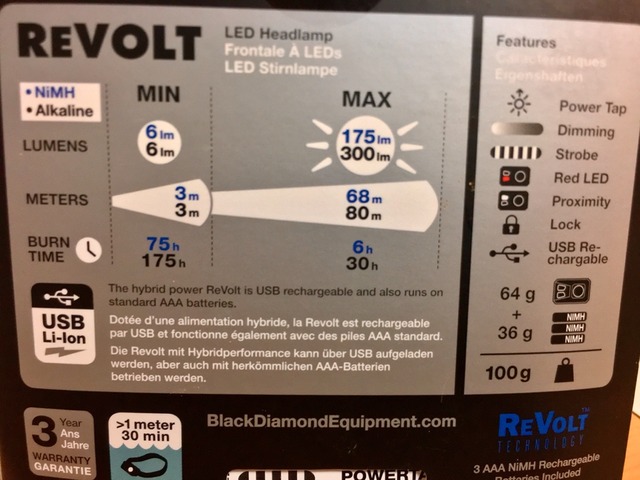 ブラックダイヤモンドのリボルト2017年モデルのスペックは、おおよそ以下の通りだ。前モデルよりも大幅にメインLEDの明るさが増した点が特徴といえる。
