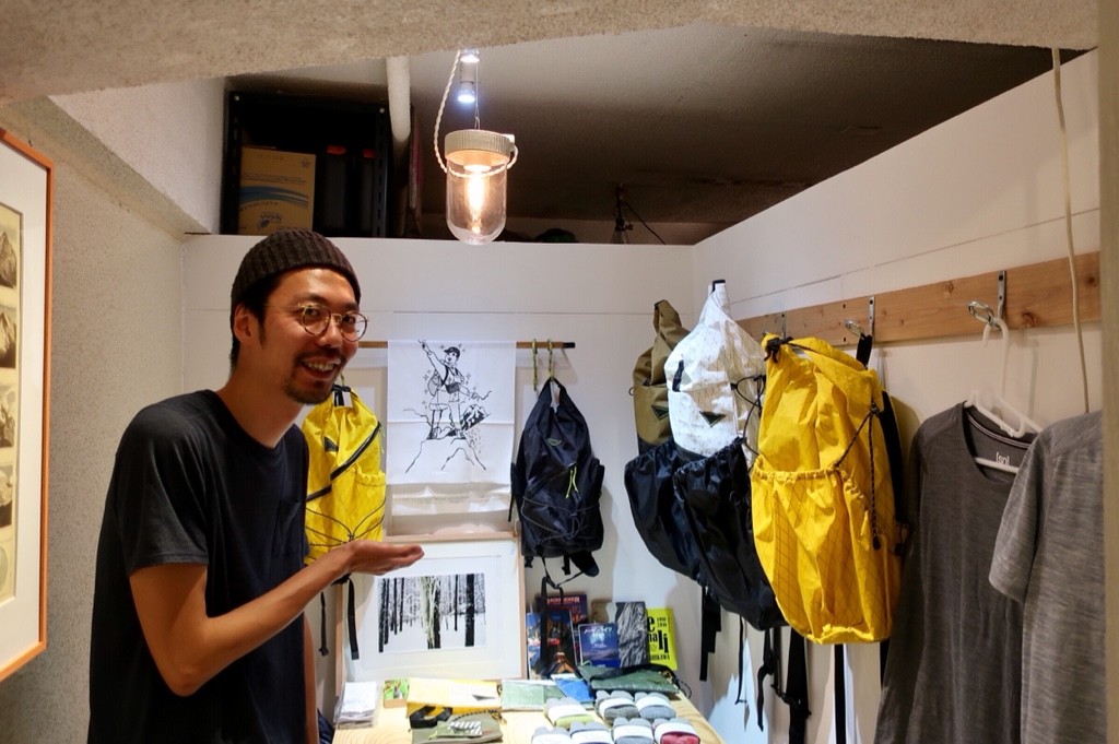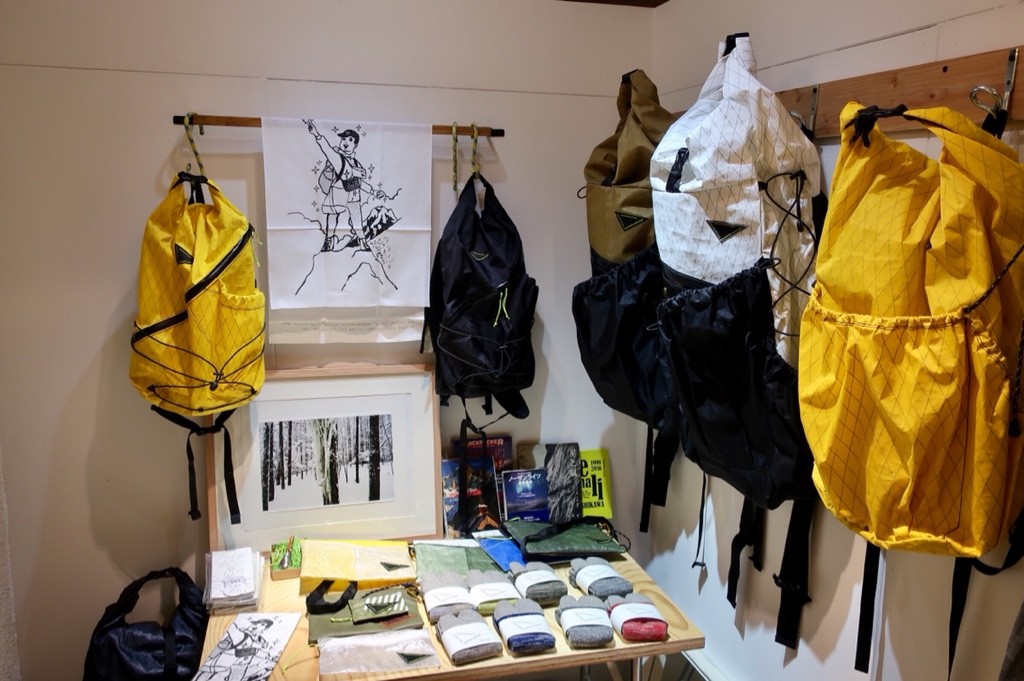 レインボー倉庫の中に入り突き当たり手前右側に、アトリエブルーボトルのテナントスペースがある。ショップというより展示スペースといった感じで、約2畳程のとてもコンパクトなスペースだ。辻岡さんとお客さんが3人入ればもう満員といった感じだろう。ザック類は壁に掛けられており、小物ギア類はテーブルに並べられていた。