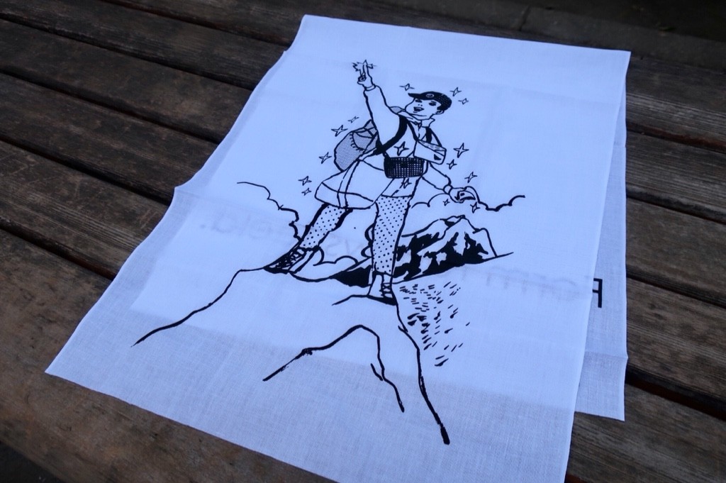 この手ぬぐいは、おそらく2016年6月に吉祥寺で行われたイベント「form follows field」で、購入者用ノベルティーとして、制作されたモノだと思われる。キラキラした感じのハイカーが各ブランドのギアを身にまとっているイラストが素敵だ。