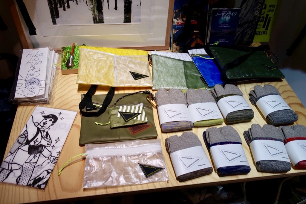 この日、購入したモノは、「Hiker's CASE」と「Hiker's SOCKS」、それに手ぬぐいの3点。「Hiker's CASE」は、キューベンファイバーのホワイト生地で、中身が透けて見えるのが良さそうなので購入。この日の朝、辻岡さんが作ってきたモノだそうだ。いいものゲット。off the grid でも黒のハイブリッドキューベンファイバーのモノを購入しているので、これで白黒と揃った。