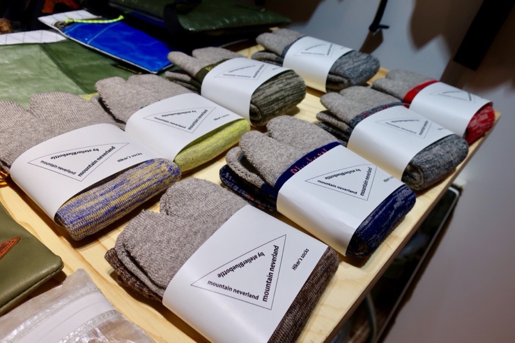 「Hiker's SOCKS」の ロングとショートも並べられていた。ロングとショートでは、使用されている素材の割合が異なるようだ。たしか、ロングのほうがメリノが多いのかな。