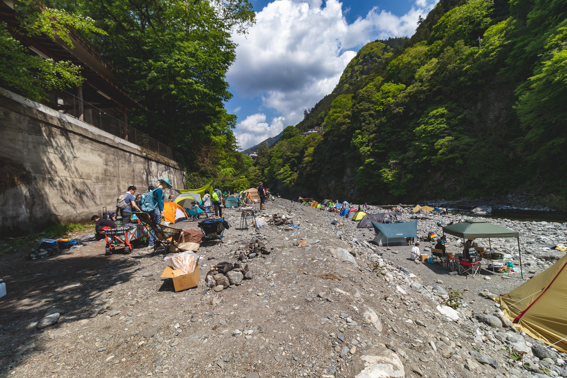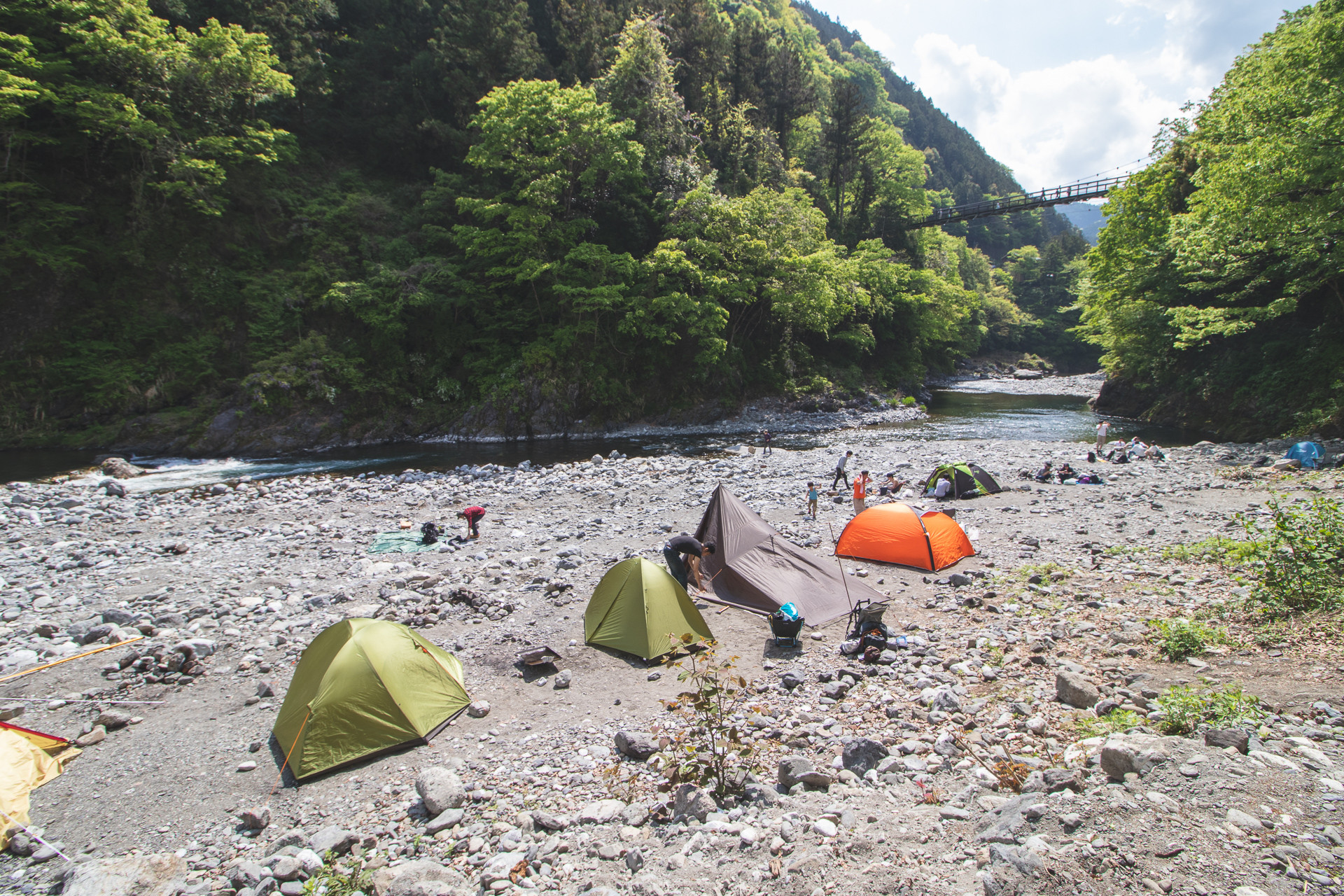 受付や必要なレンタル品の手配を終え、川沿いへと降りていく。基本的にテントが張れるのは川沿いの砂利の場所だ。