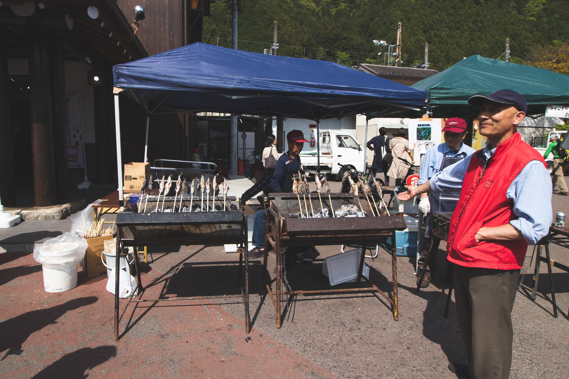 奥多摩駅の改札口を出たら、なんと、鮎の塩焼きを売っている。このやる気満々の売り方がなかなかいい。食べたいけど、テントを片さなきゃいけなかったので、そそくさと退散。