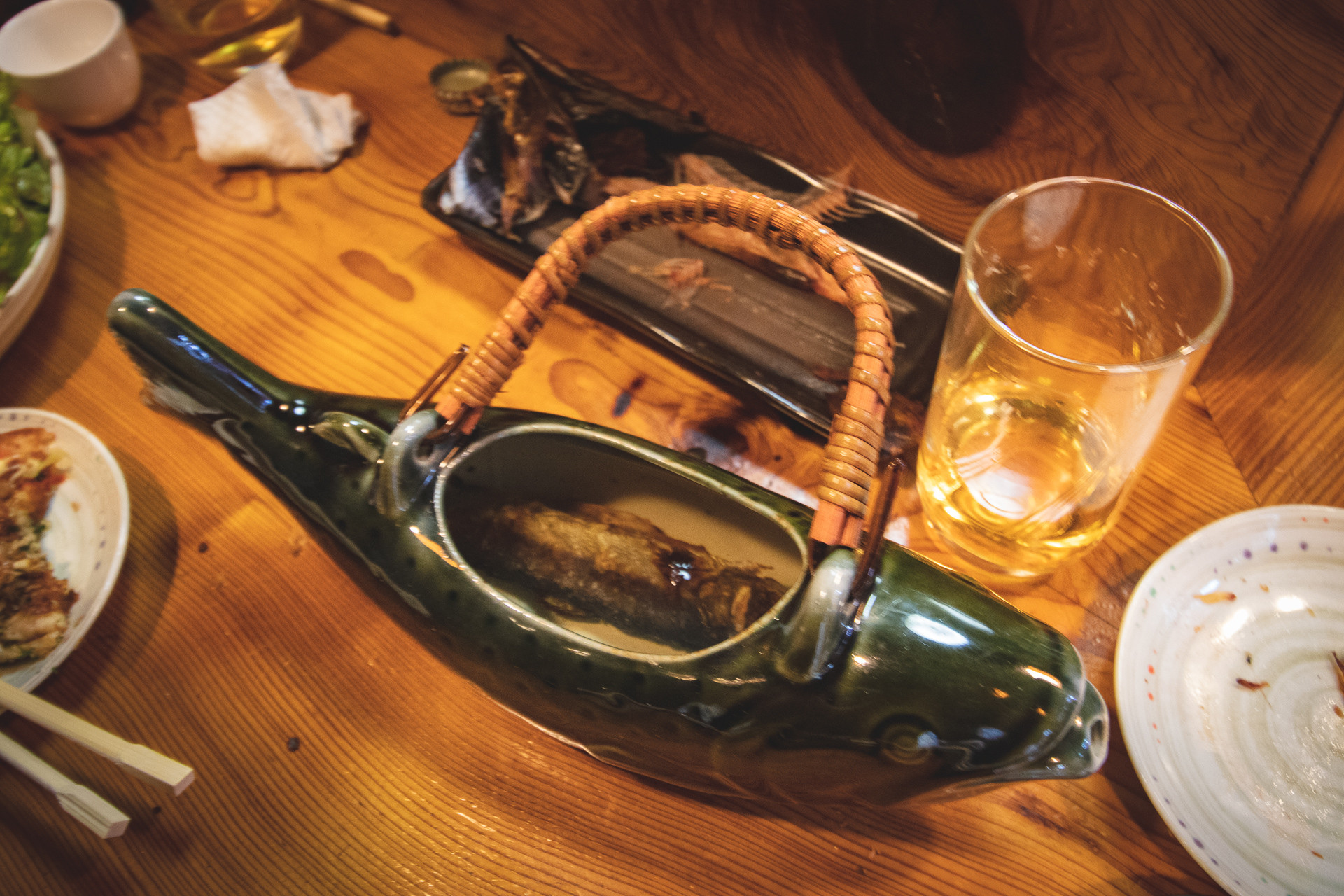 僕は、知らなかったんだけど、日本酒の中に岩魚の焼いたやつをしばらくつけて、味や風味をお酒に移していただく飲み方みたいです。この入れ物がまた風情があって良かった。