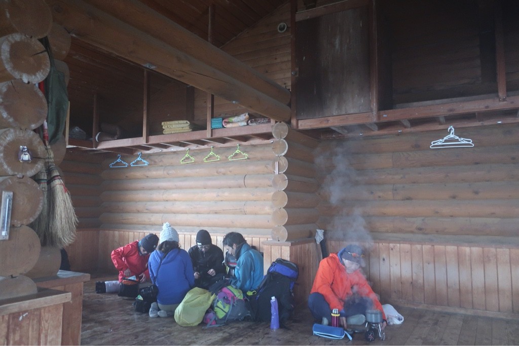 避難小屋の中では、みなさん、休憩して暖かい物をつくっていた。