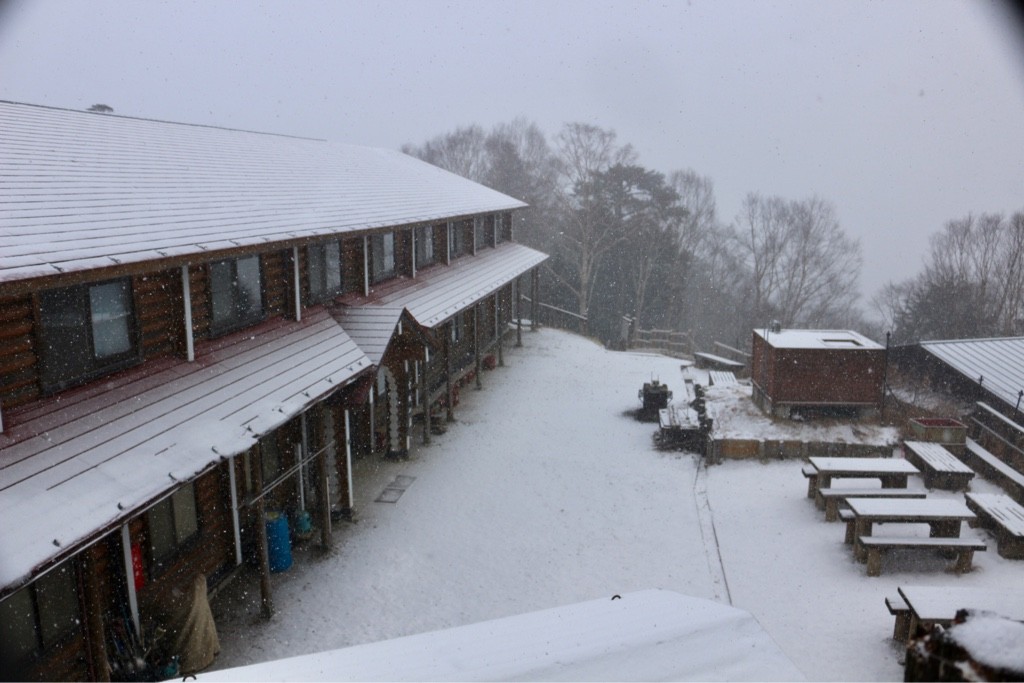 山荘前も、この数十分のうちに降った雪があっという間に積もっている。