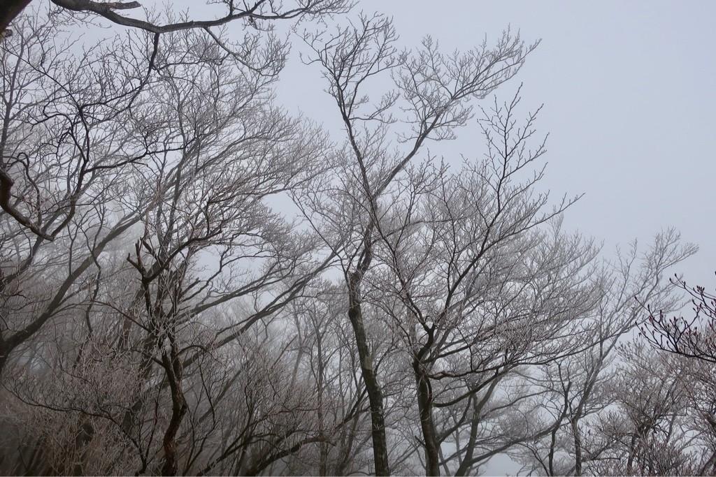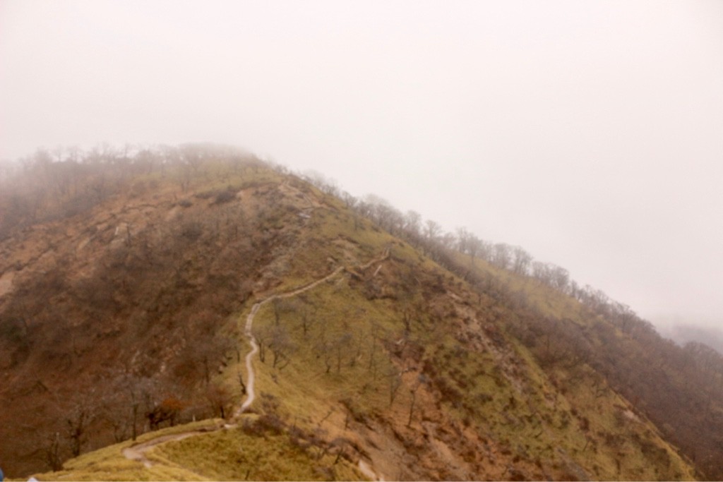 昨夜からの雲で視界は悪い。ほとんど雲の中をゆく感じ。
