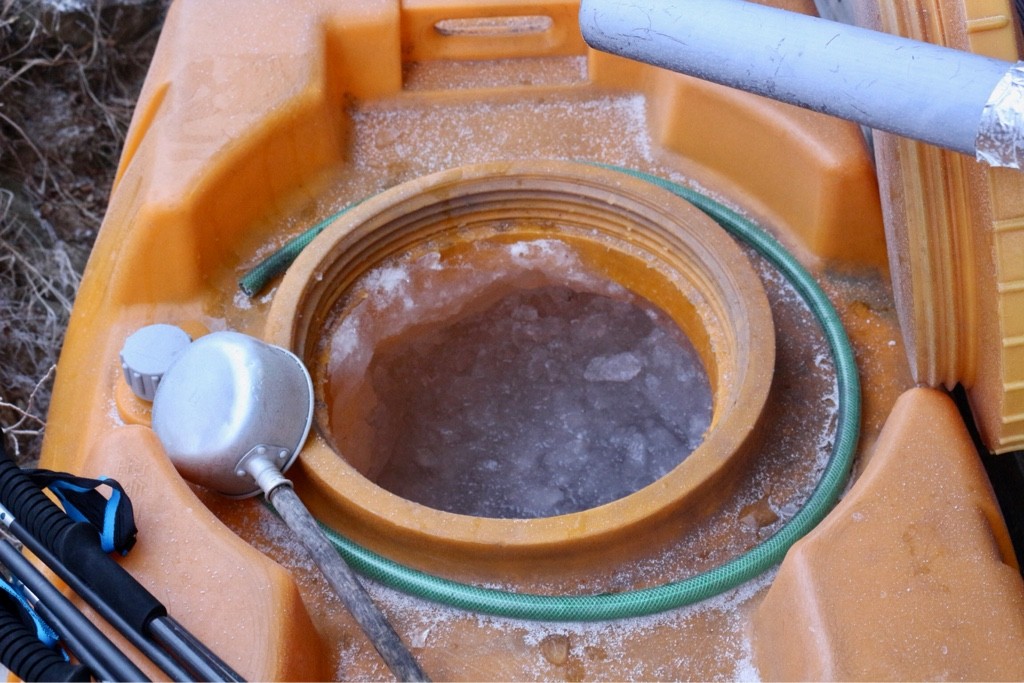小屋を出ると、小屋脇に備えられている雨水を貯めるタンクは凍っていた。