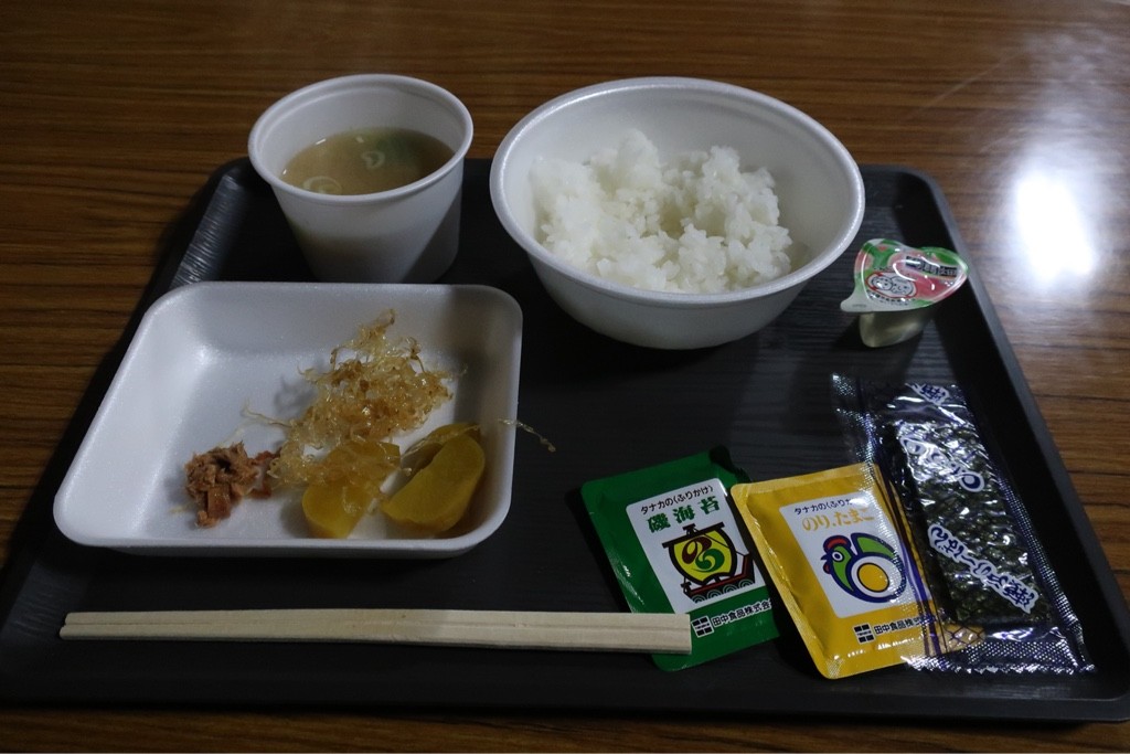 写真だと副菜が質素に思われるかもしれないが、これは筆者が朝から食べれないかもしれないと思い少量にしたから。昨夜と同じようにおかずを好きなだけ取り、ご飯とお味噌汁をいただく。
