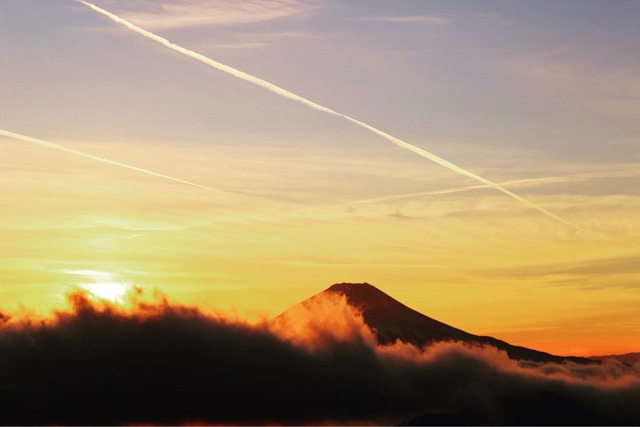 遠くまで見渡せる冬の澄み渡った空気。富士山横に沈む夕陽。