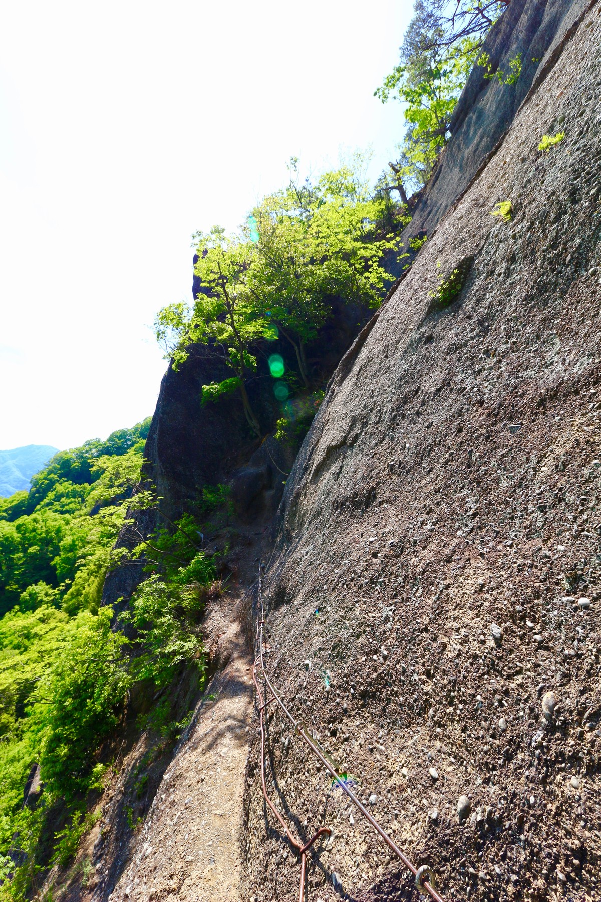 岩をトラバースして進むんですが、足を滑らせたら崖下へ真っ逆さまです。